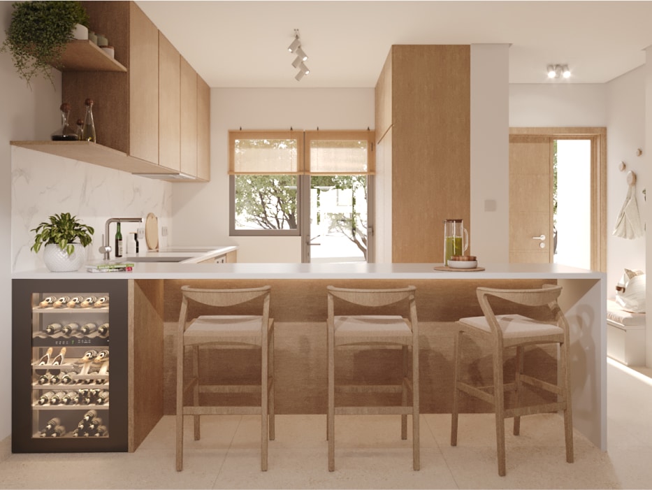 This kitchen will provide a delightful experience for both casual meals and elaborate entertaining. All kitchens feature a wooden finishing, giving them a warm and inviting look.